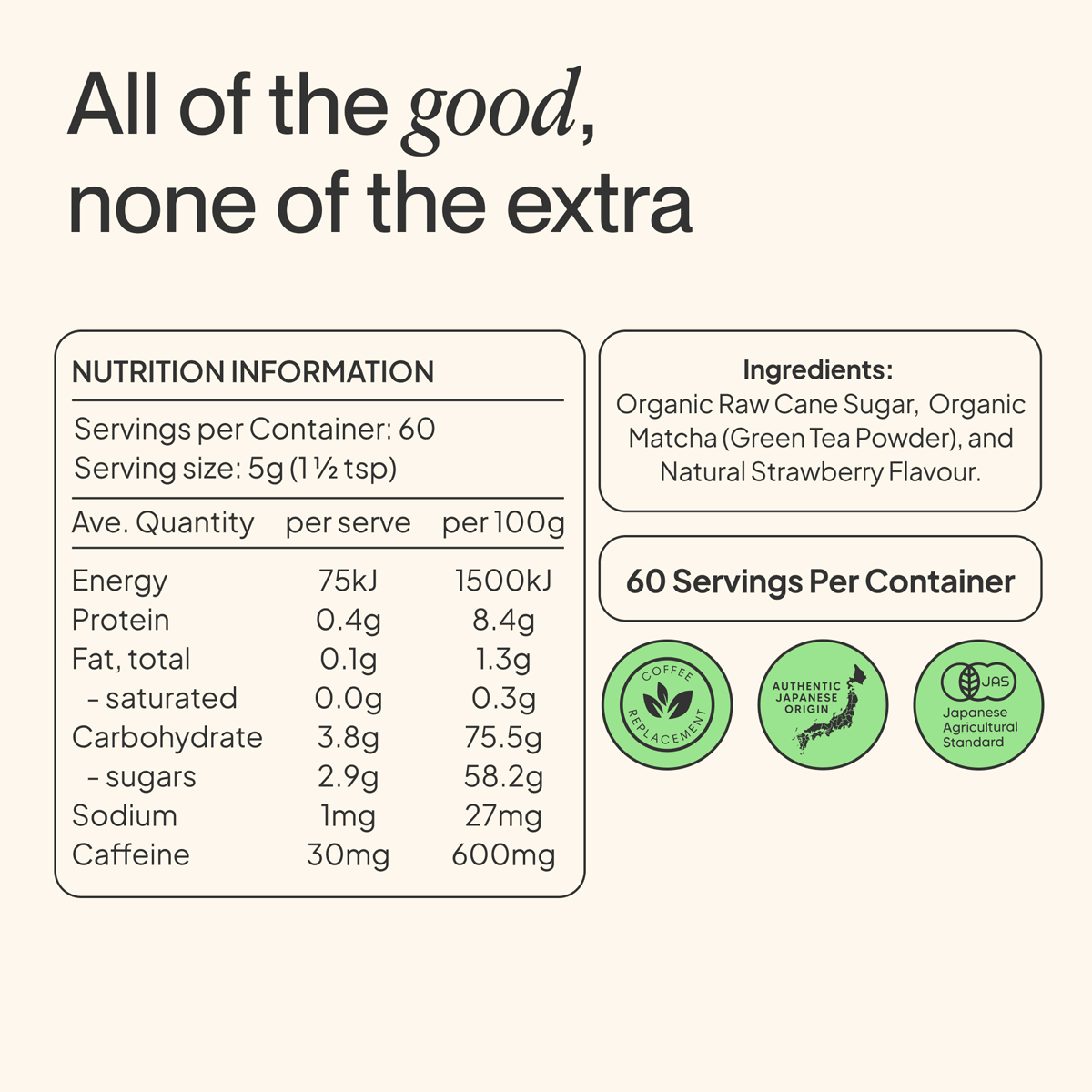 Organic Raw Cane Sugar, Organic Matcha (Green Tea) Powder, Natural Strawberry Flavour.Product Specifications