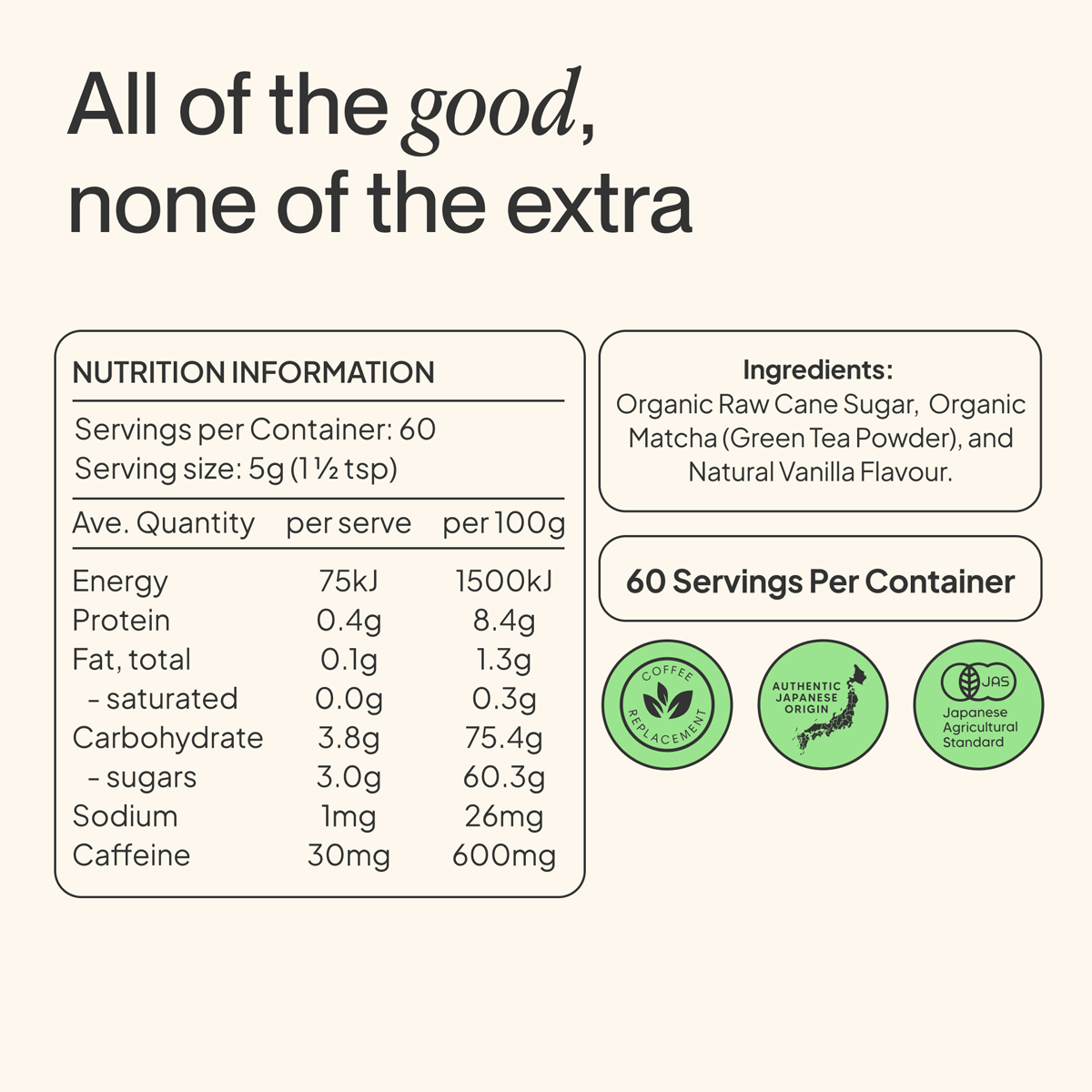 Organic Raw Cane Sugar, Organic Matcha (Green Tea) Powder, Natural Vanilla Flavour.Product Specifications