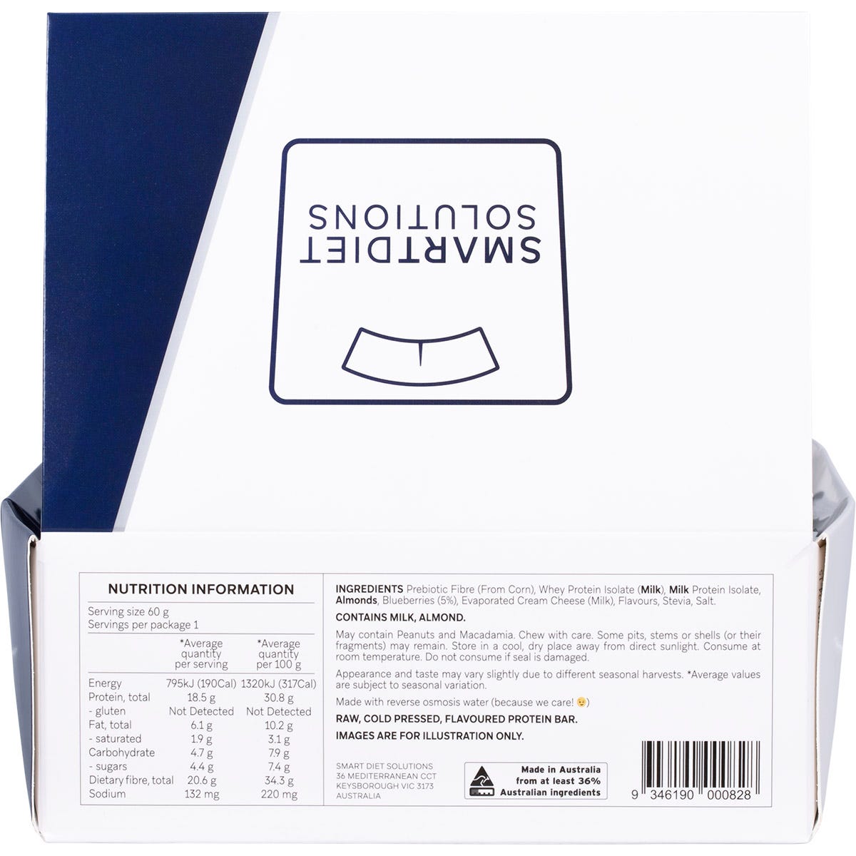 Prebiotic Fibre (From Corn), Whey Protein Isolate, Milk Protein Isolate, Almonds, Blueberries, Evaporated Cream Cheese, Flavours, Stevia, Salt