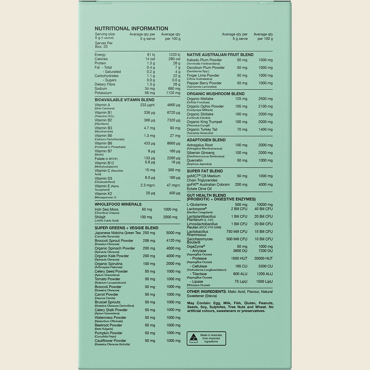 Super Greens & Vege Blend Japanese Matcha Green Tea, Broccoli Sprout Extract, Organic Spinach Powder, Organic Kale Powder, Organic Spirulina, Celery Seed Powder, Tomato Powder, Broccoli Powder, Carrot Powder, Brussels Sprouts Powder, Celery Stalk Powder, Watercress Powder, Beetroot Powder, Pumpkin Powder, Cauliflower Powder, Organic Mushroom Blend (Organic Maitake Mushroom, Organic Cordyceps Militaris, Organic Shiitake Mushroom, Organic King Trumpet Mushroom, Organic Turkey Tail Mushroom), Gut Health Blend L-Glutamine, Digezyme® (Amylase, Protease, Cellulase, Tilactase, Lipase), Lactospore® (Bacillus Coagulans), Lactiplantibacillus Plantarum, Limosilactobacillus Reuteri, Lactobacillus Rhamnosus, Saccharomyces Boulardii), Flavour, Malic Acid, Adaptogen Blend (Astragalus Root, Siberian Ginseng, Quercetin) Super Fat Blend (Gofat® Australian Cobram Estate Olive Oil GoMTC® C8 Medium Chain Triglycerides), Native Australian Fruit Blend (Kakadu Plum Powder, Davidson Plum Powder, Finger Lime Powder, Pepper Berry Powder), Bioavailable Vitamin Blend (Vitamin C (Ascorbic Acid), Vitamin E (Dl-Alpha Tocopherol), Vitamin B3 (Niacinamide), Vitamin B5 (Pantothenic Acid), Vitamin B6 (Pyridoxal 5-Phosphate), Vitamin B2 (Riboflavin), Vitamin B1 (Thiamin), Vitamin A (Beta Carotene), Vitamin K2 (Menaquinone-7), Vitamin D3 (Cholecalciferol), Vitamin B7 (Biotin), Folate (5-Mthf), Vitamin B12 (Methyl cobalamin)), Wholefood Mineral Blend (Organic Himalayan Shilajit (=50% Fulvic Acid, Irish Sea Moss), Natural Sweetener (Stevia).Product Specifications