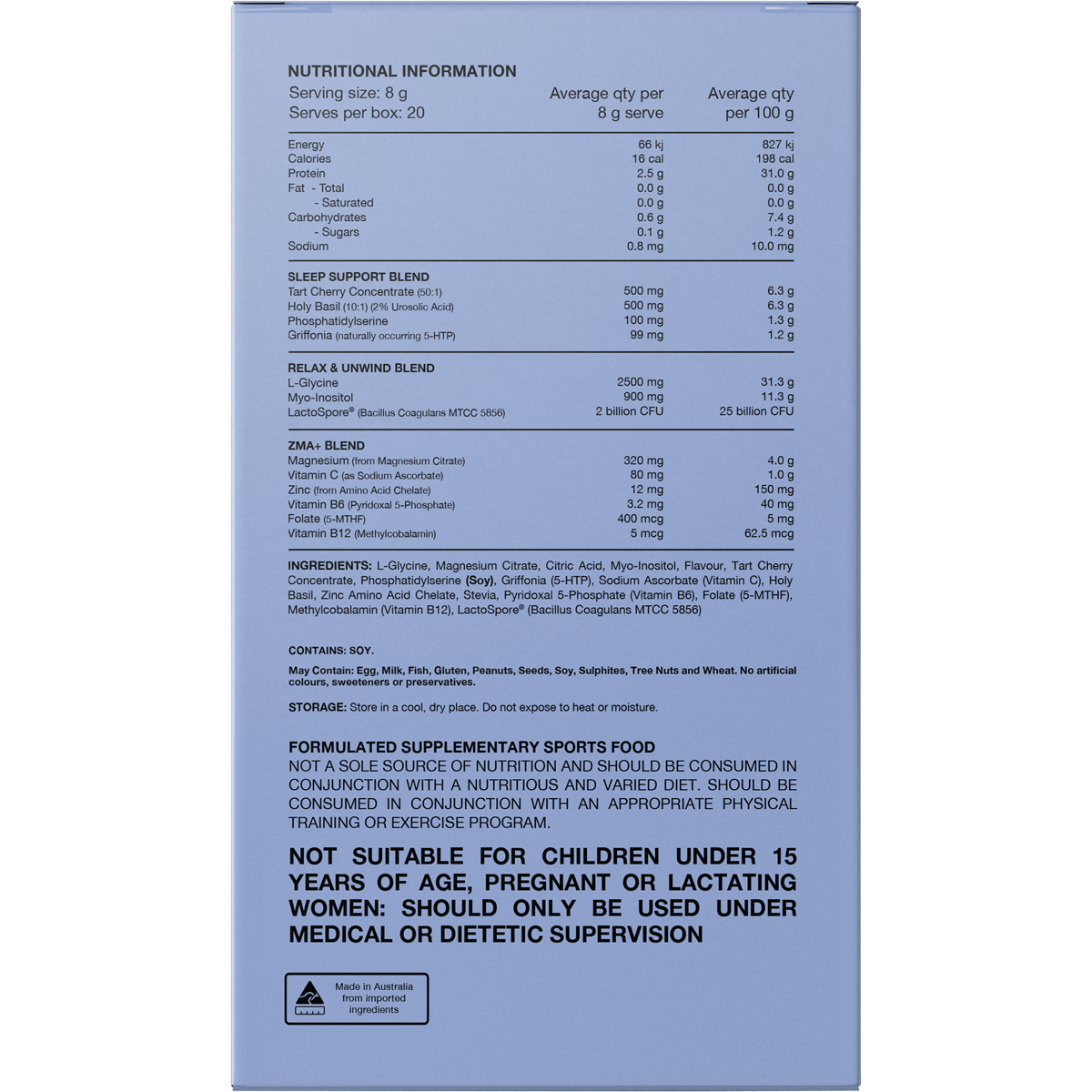 L-Glycine, Magnesium Citrate, Citric Acid, Myo-Inositol, Flavour, Tart Cherry, Phosphatidylserine (Soy), Griffonia (5-Htp), Vitamin C (As Sodium Ascorbate), Holy Basil (2% Urosolic Acid), Zinc Amino Acid Chelate, Stevia, Vitamin B6 (P5P), Methyl Folate (5-Mthf), Vitamin B12 (Methylcobalamin), Lactospore® (Bacillus Coagulans Mtcc 5856)